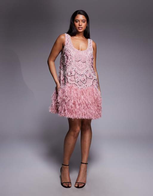 ASOS LUXE Curve embellished scoop neck mini dress with faux feather hem in pink