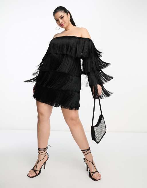 ASOS LUXE Curve off the shoulder fringe mini dress in black