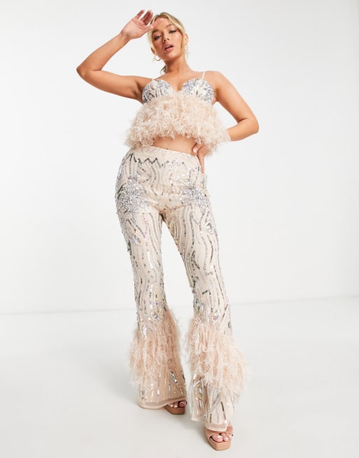 ASOS LUXE embellished gemstone set with faux feather trim in blush