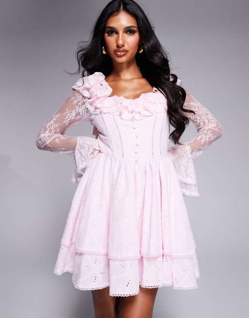 ASOS LUXE eyelet corseted lace sleeve mini skater dress in pink