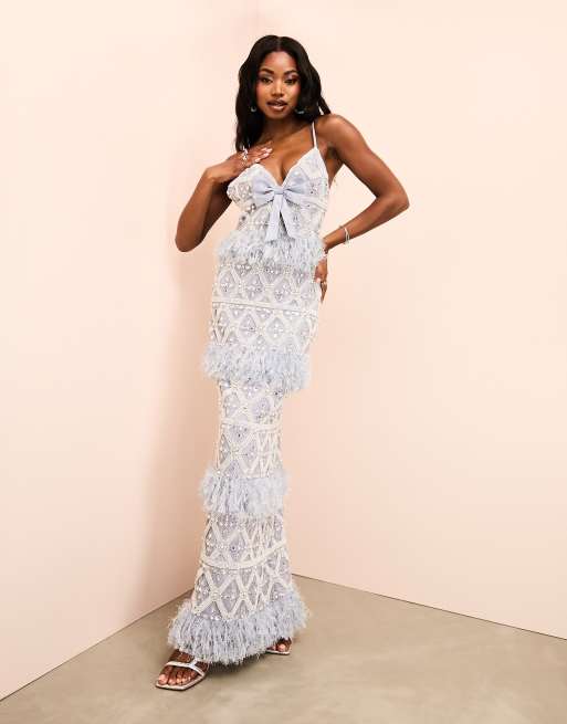 ASOS LUXE gem encrusted maxi dress with bow detail and faux feather in light gray