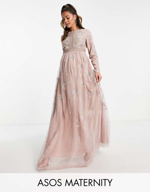 ASOS DESIGN Maternity Bridesmaid pearl embellished long sleeve maxi dress with floral embroidery in rose