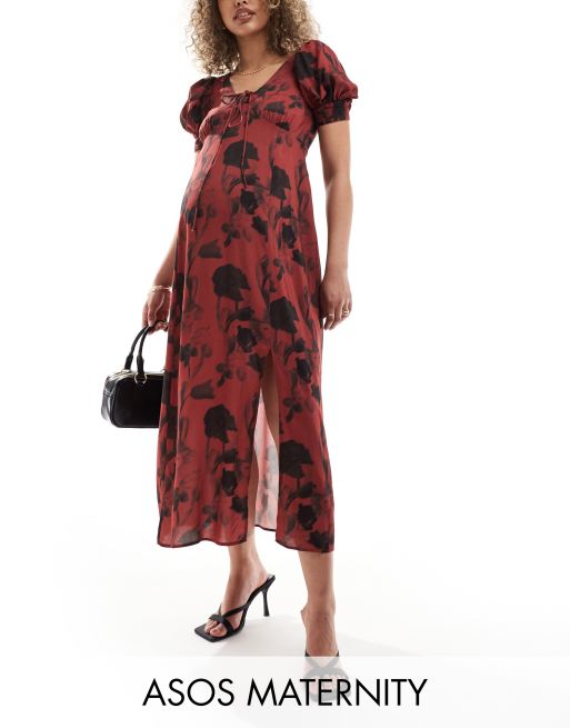 ASOS DESIGN Maternity puff sleeve lace up midi dress in rust print