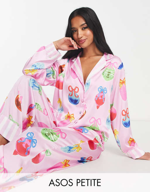 ASOS DESIGN Petite Christmas bauble satin shirt & pants pajama set with contrast stripe cuffs in pink