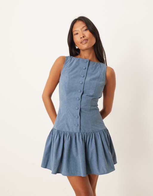 ASOS DESIGN Petite corduroy slash neck button down dropped waist mini dress in sea blue
