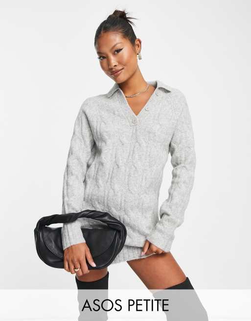 ASOS DESIGN Petite knitted mini sweater dress with open collar in cable in gray