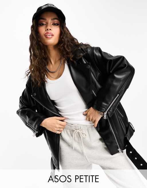 ASOS DESIGN Petite longline oversized faux leather biker jacket in black