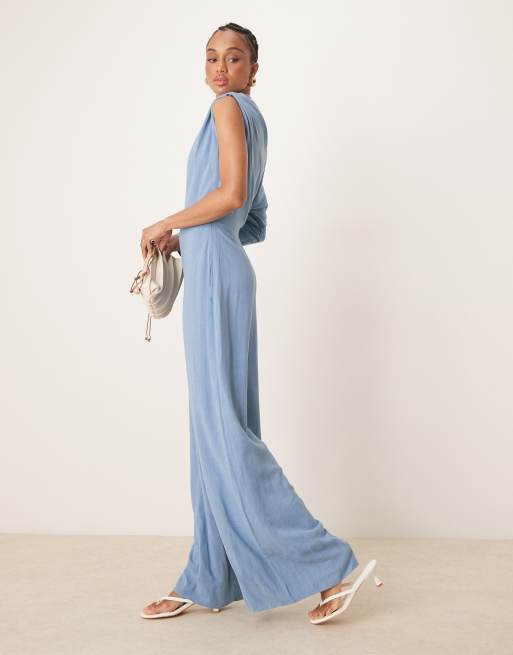 ASOS DESIGN Tall linen mix fallen shoulder jumpsuit in faded denim