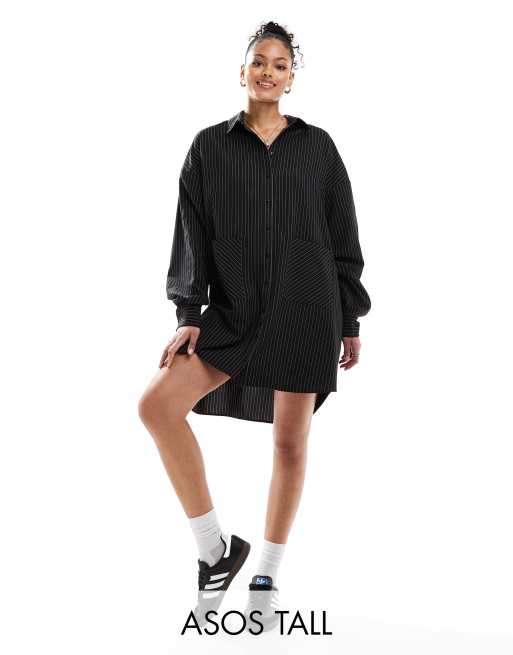 ASOS DESIGN Tall oversized shirt dress with dropped pockets in black pinstripe