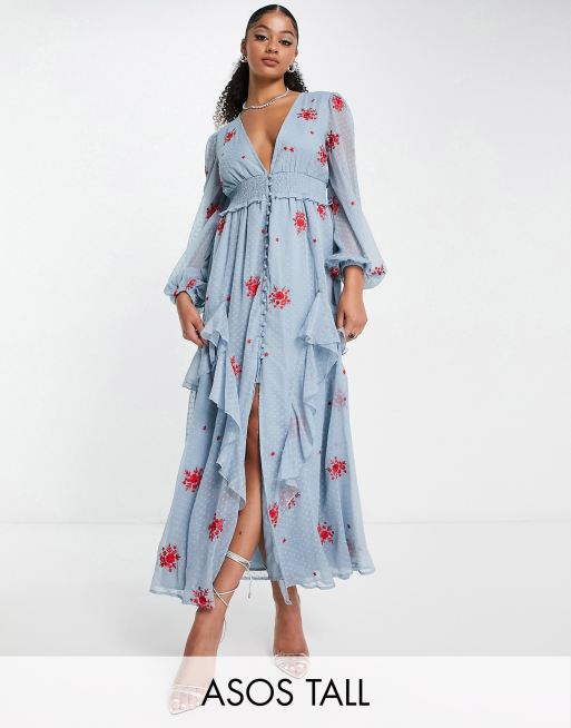 ASOS DESIGN Tall shirred waist button up midi tea dress with all over embroidery in dusty blue