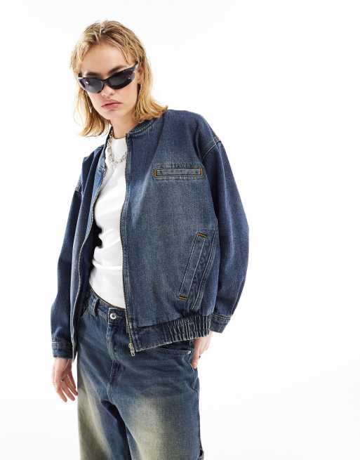 ASOS Weekend Collective denim bomber jacket in mid blue wash