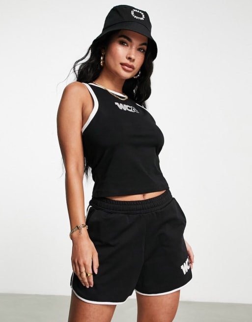 ASOS Weekend Collective tank top and runner shorts with tipping and WCA logo in black