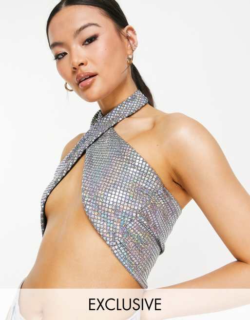 ASYOU cross front halter top in holographic sequin