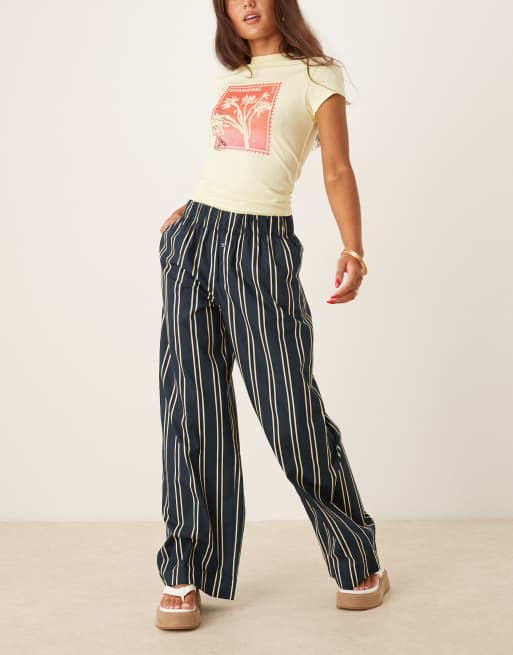 AWARE boxer style wide leg poplin pants in navy and cream stripes