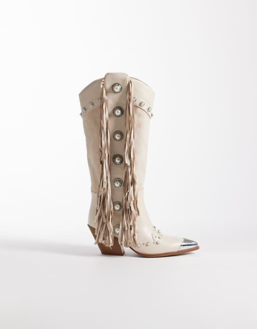 Azalea Wang Pelagius embellished tassel knee boots in cream