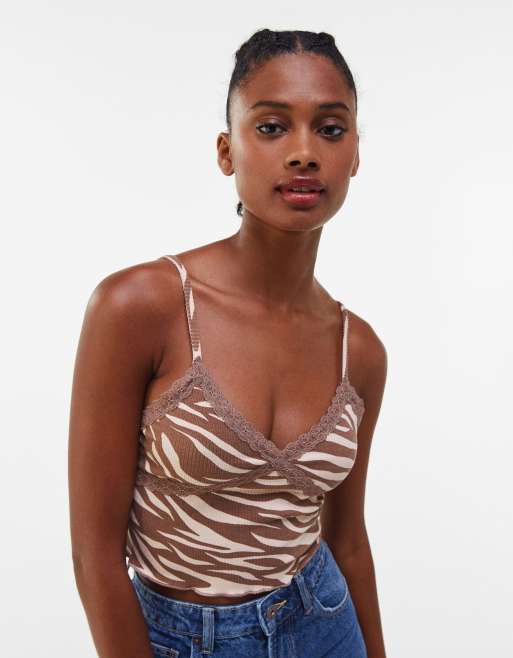 Bershka contrast lace trim 90s cami in brown zebra