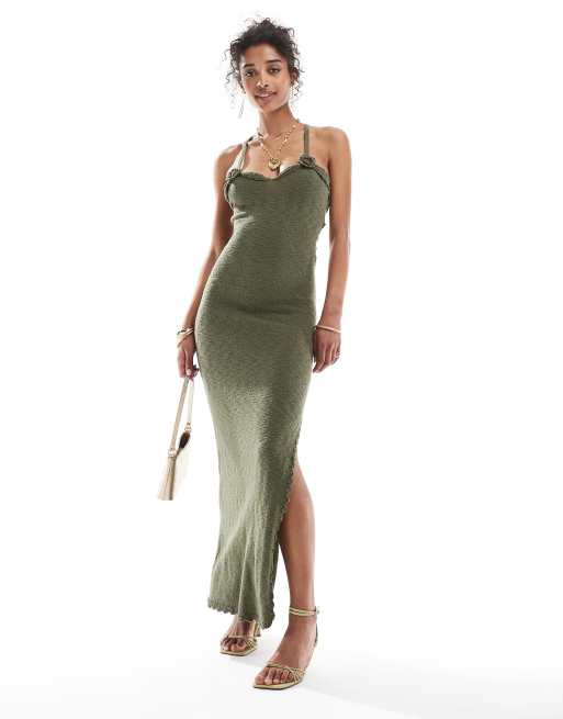 Bershka flower applique knit maxi dress in khaki green