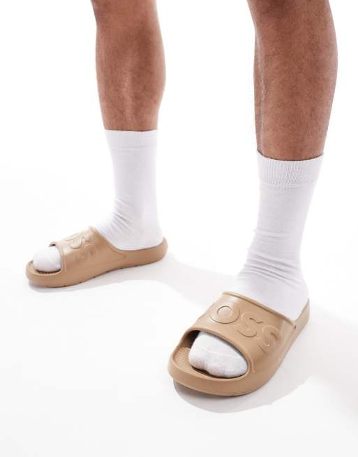 BOSS Dario embossed logo moulded slides in tan