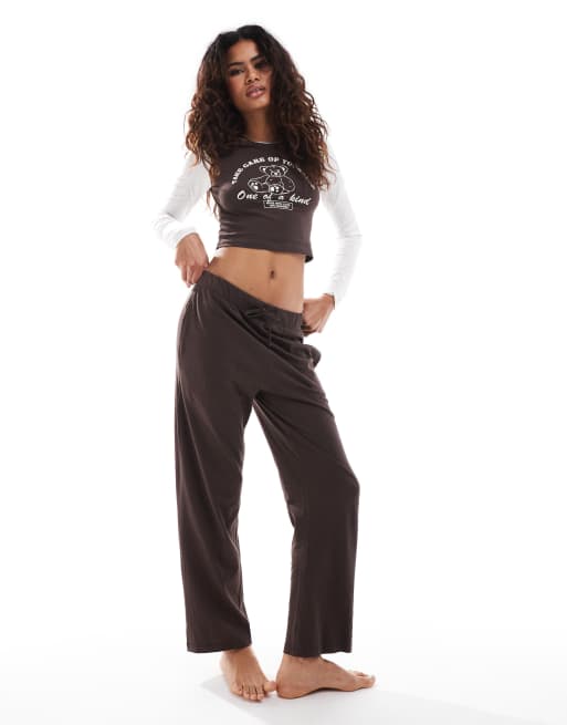 Brave Soul cropped long sleeve t-shirt and plaid pants pajama set in ecru and navy