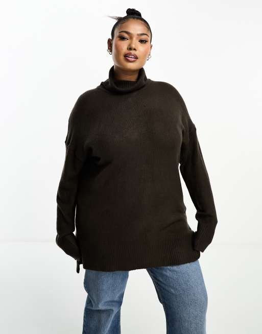 Brave Soul Plus ming knitted roll neck oversized sweater in brown