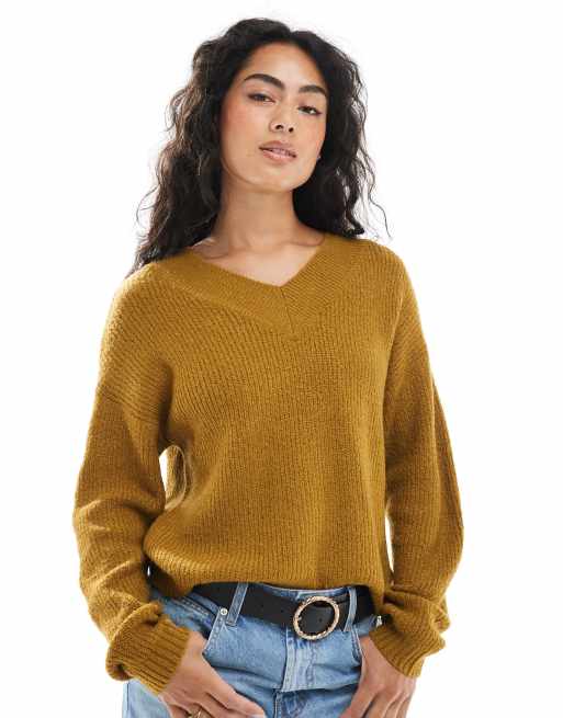 Brave Soul v-neck fisherman knit sweater in olive green