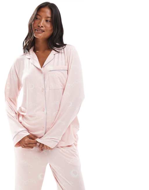 Chelsea Peers Petite poly long sleeve camp collar pajama set in pink night sky print