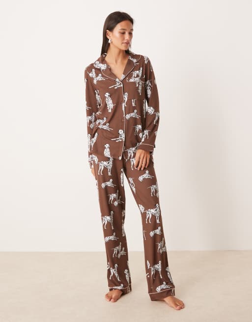 Chelsea Peers Exclusive Dalmation long sleeve revere top & pant pajama set in chocolate browns