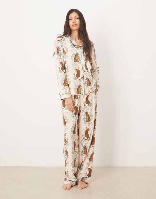 Chelsea Peers long sleeve camp collar shirt and pants pajama set in botanical tiger print