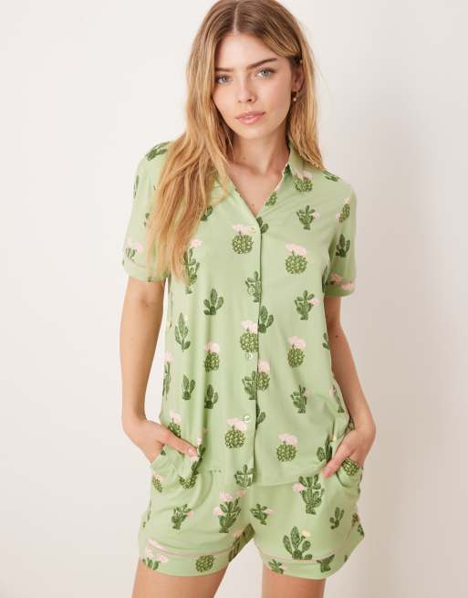 Chelsea Peers poly short sleeve revere and shorts set in cactus pirnt