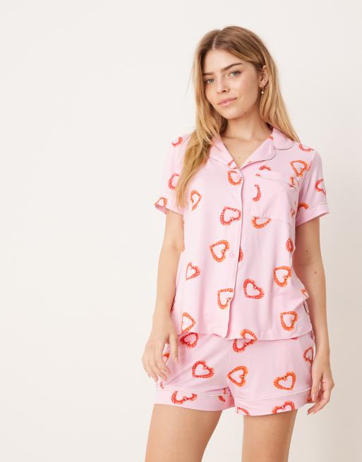 Chelsea Peers poly short sleeve revere and shorts set in heart print