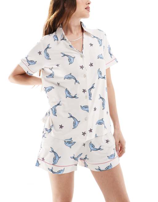 Chelsea Peers poly short sleeve revere top and short set in dolphin print