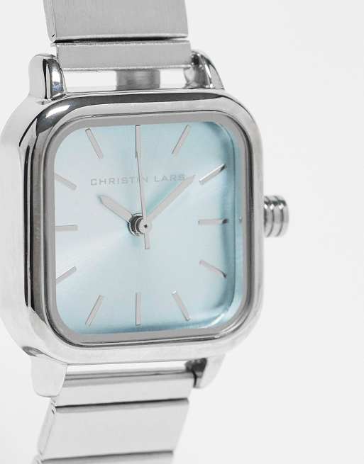 Christin Lars square face link strap watch in silver and blue