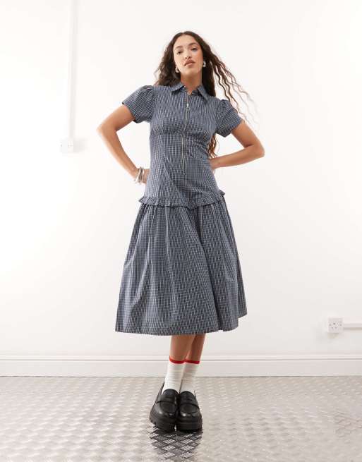 COLLUSION drop waist midi shirt dress in blue plaid