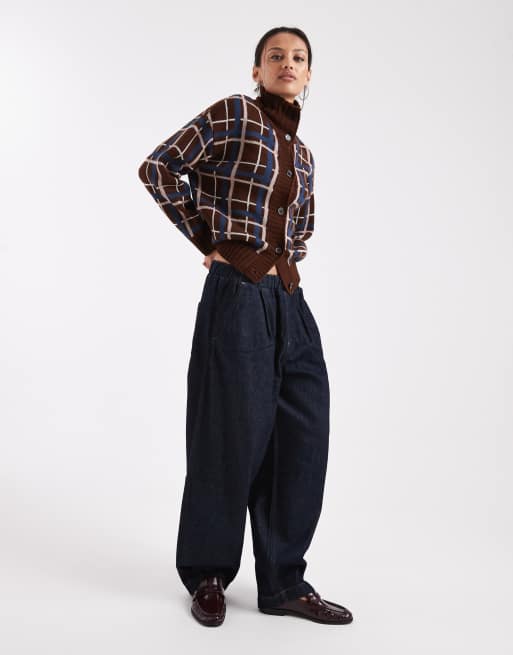 COLLUSION funnel neck check button down sweater in brown