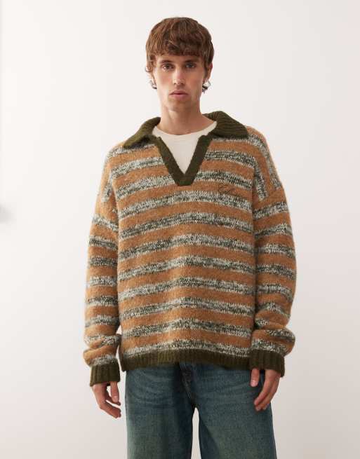 COLLUSION knit striped boxy collared sweater in brown