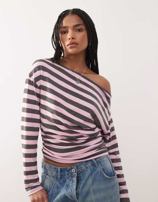 COLLUSION off-the-shoulder top in pink and gray stripes