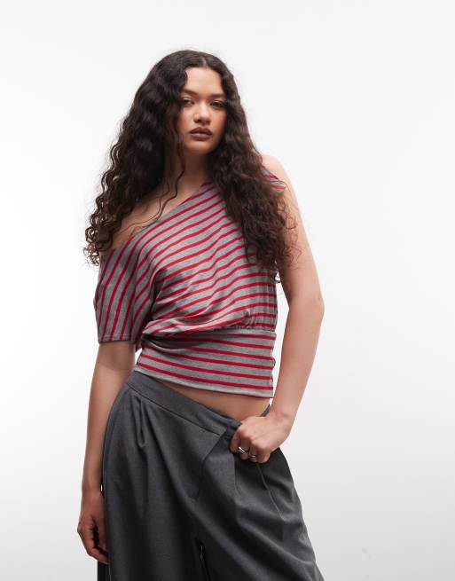 COLLUSION off the shoulder top with cinched waist in red stripes