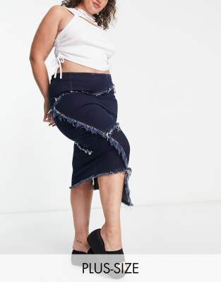 COLLUSION Plus exposed seam maxi asymmetric denim midi skirt in blue