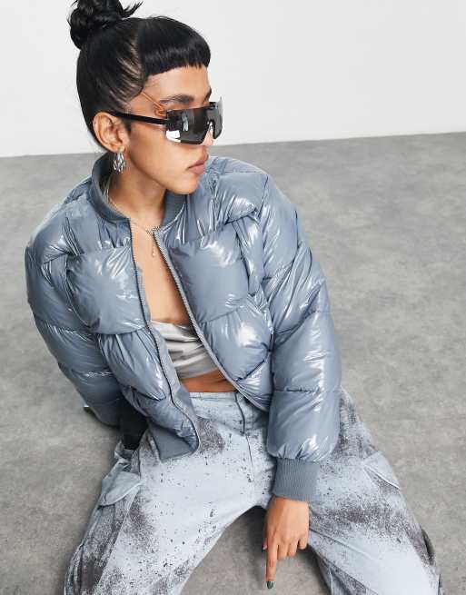 COLLUSION quilted weaved high shine puffer jacket in iced blue
