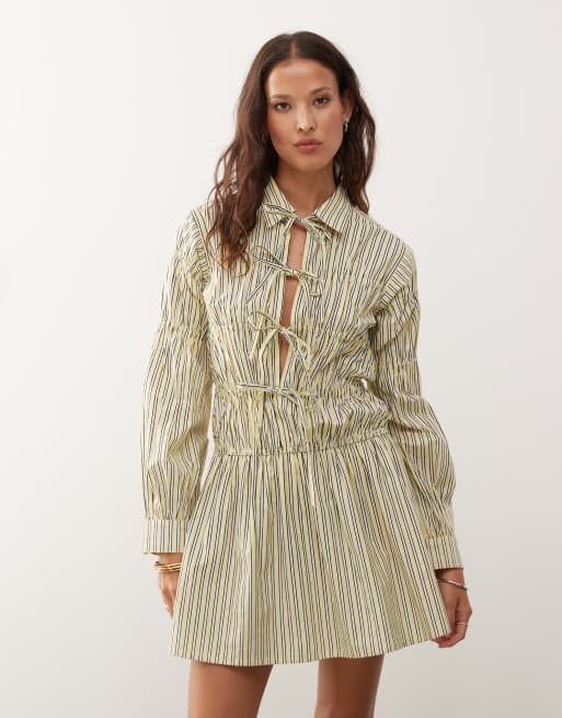 COLLUSION shirred tie detail shirt dress in yellow stripes