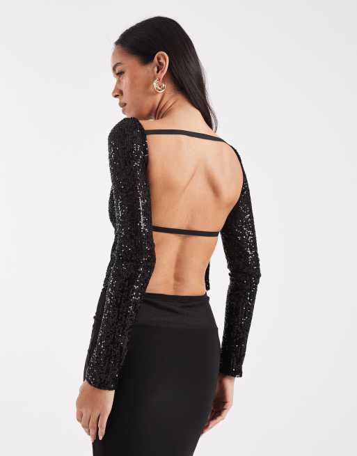 COLLUSION slash neck backless sequined long sleeve top in black