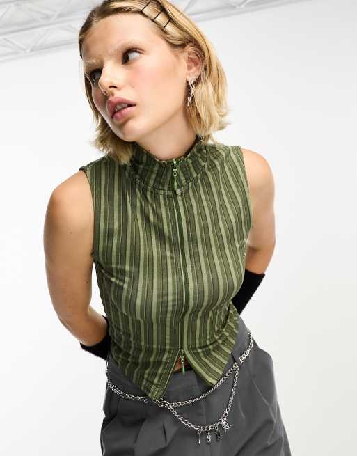 COLLUSION striped funnel neck top in green