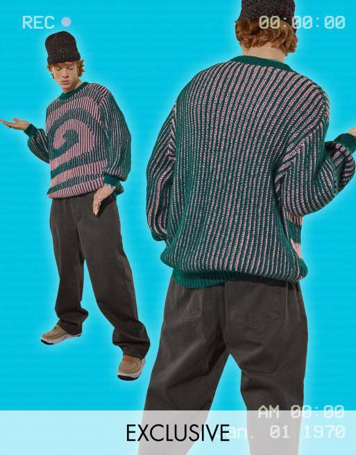 COLLUSION Unisex chunky open knit sweater with swirl jacquard in green and pink