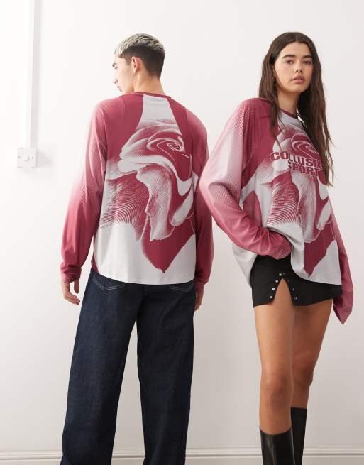 COLLUSION Unisex graphic soccer t-shirt in burgundy