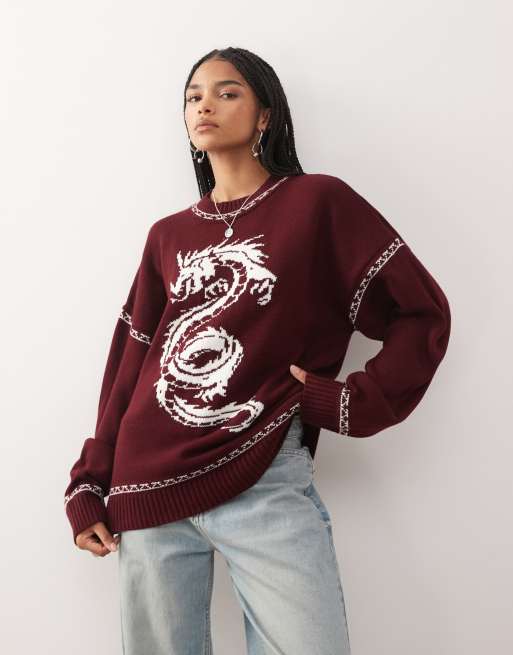 COLLUSION Unisex knit sweater with dragon graphic in burgundy