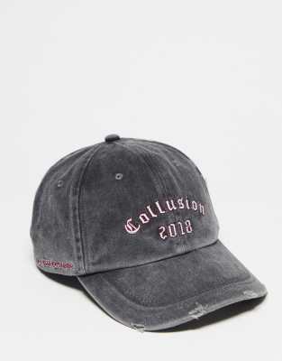 COLLUSION Unisex washed distressed slogan collegiate cap in gray