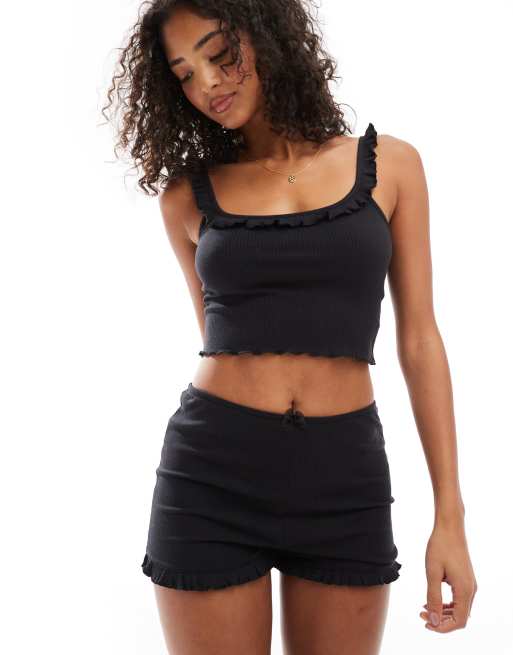 Cotton On rib ruffle pajama short set in black