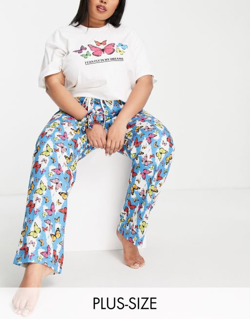 Daisy Street Plus oversized T-shirt and pants pajama set with scrunchie in butterfly print