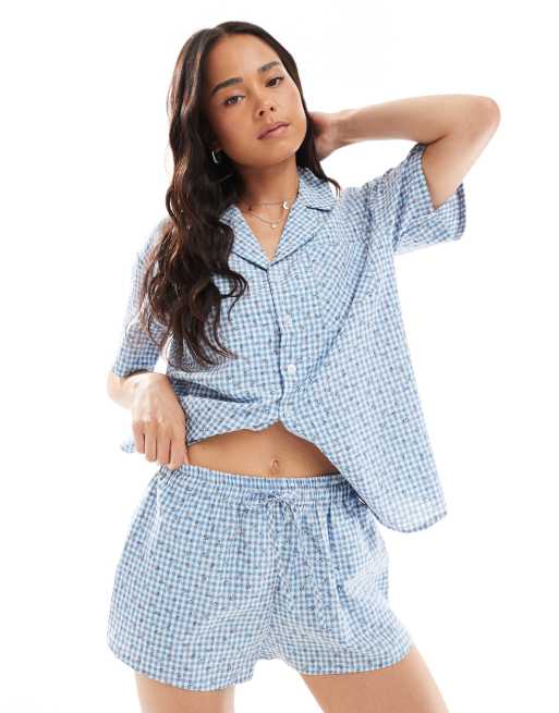 Daisy Street boxer style pajama shorts with floral details in blue gingham