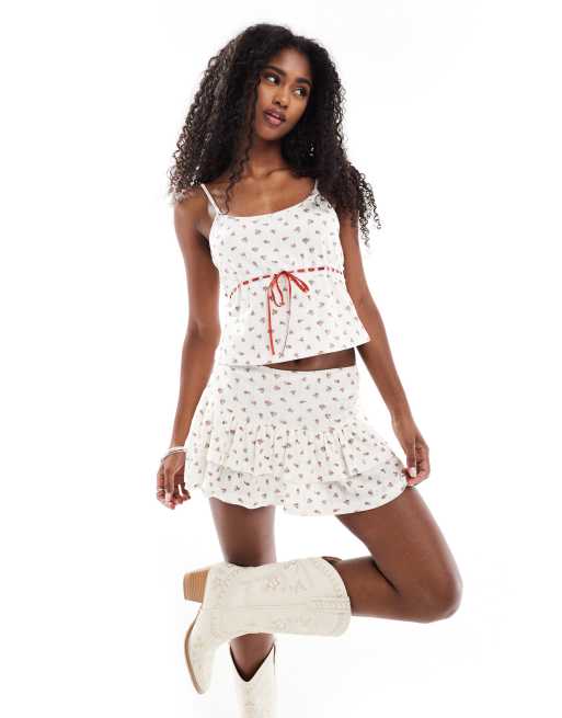 Daisy Street low rise pointelle mini skirt in red cream delicate floral - part of a set